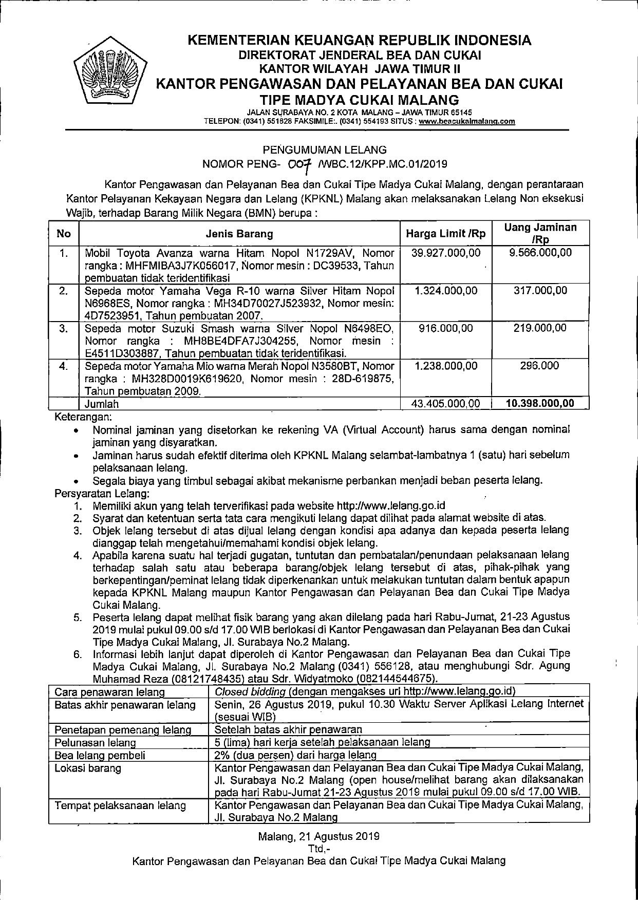 Bea Cukai Malang Pa Twitter Pengumuman Lelang Bea Cukai Malang Dengan Perantara Kpknl Malang Jl S Supriyadi 157 Malang Akan Melaksanakan Lelang Non Eksekusi Wajib Selengkapnya Https T Co Ernhxi9psw Twitter